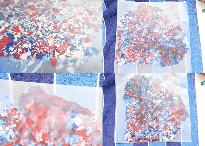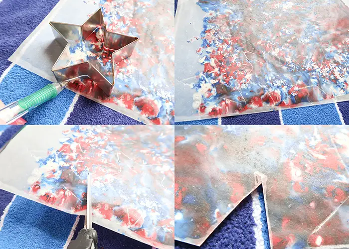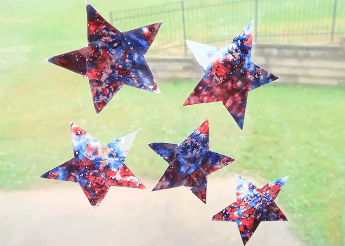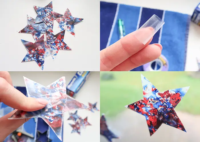 Make a suncatcher garland by creating several mini stars and stringing them together with ribbon for a patriotic banner!